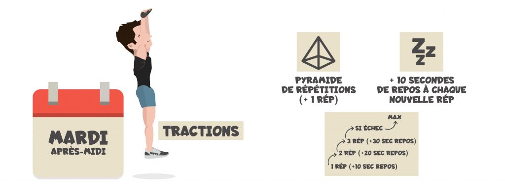 Le Lundi, faire 5 séries de tractions avec le maximum de répétitions, en prenant 1 minute 30 de repos entre chaque. Ne pas se préoccuper du nombre de répétition mais s’assurer d’aller jusqu’à l’échec à chaque nouvelle série.