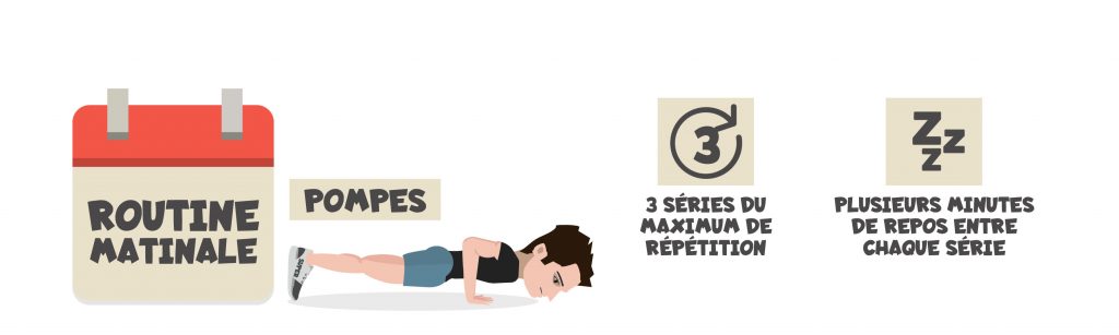 Tous les matins (du lundi au vendredi) effectuez 3 séries de pompes, jusqu’à l’échec. Elle vont permettre de renforcer les muscles de la ceinture scapulaire et travailler l’endurance de force. Le temps de pause entre les séries est complet (de plusieurs minutes) recommencez une fois que vous vous sentez prêt.